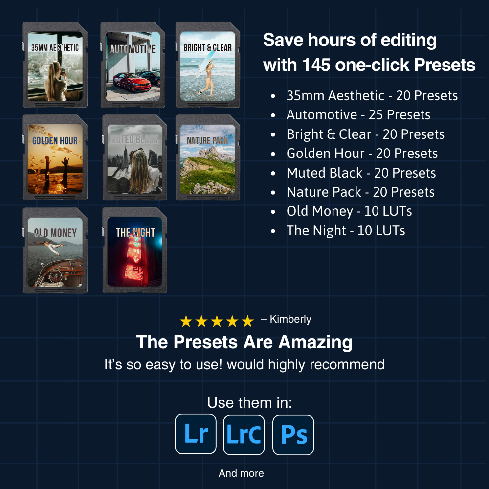Our presets are designed to be compatible with popular photo editing software like Lightroom, Lightroom Classic, and Photoshop.